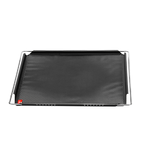 Metal baking tray designed in non stick coating and perforated pattern for perfect crispy baking effect, suitable for baking pizza.