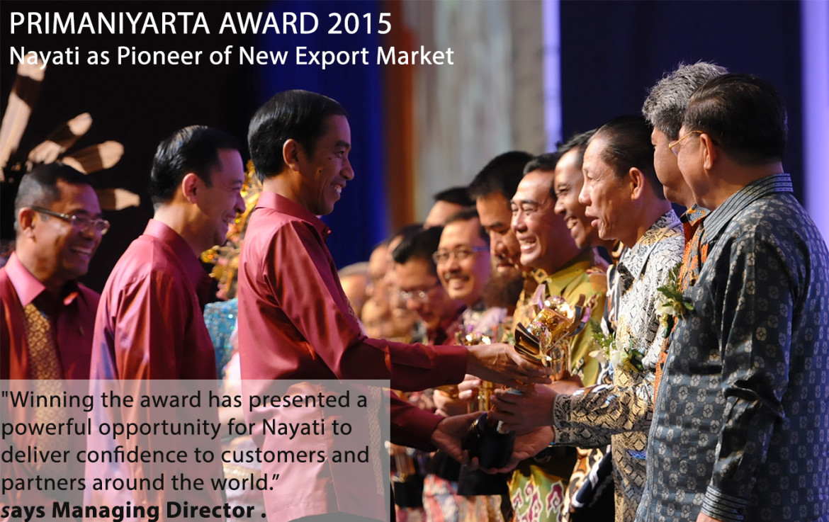 Through 30 over years of business excellence, Nayati has been working continuously to deliver value to customers and partners and in the year of 2015, Nayati has accomplished another important milestone in the industry. Ministry of Trade and Industry select a few chosen manufacturers, deemed worthy, to participate in Export Award “Primaniyarta” and 2015, Nayati landed the award during its first nomination under the category of “Pioneer of New Export Market”. The award was granted on October 20, 2015, by the president of the Republic of Indonesia himself as he opens the 30th Trade Expo Indonesia.